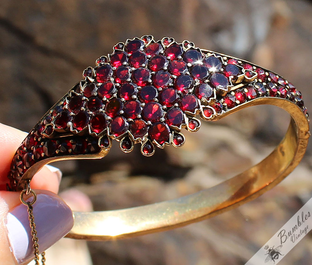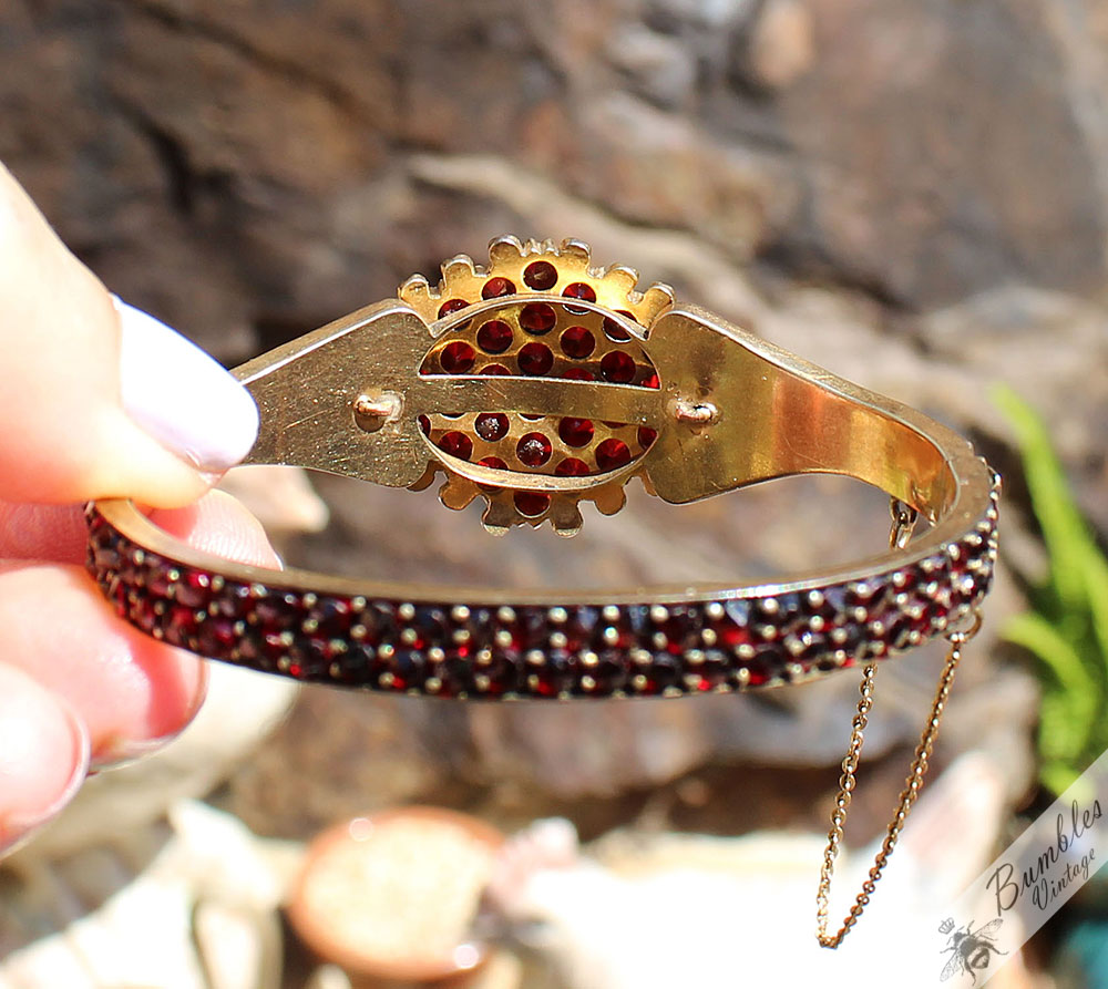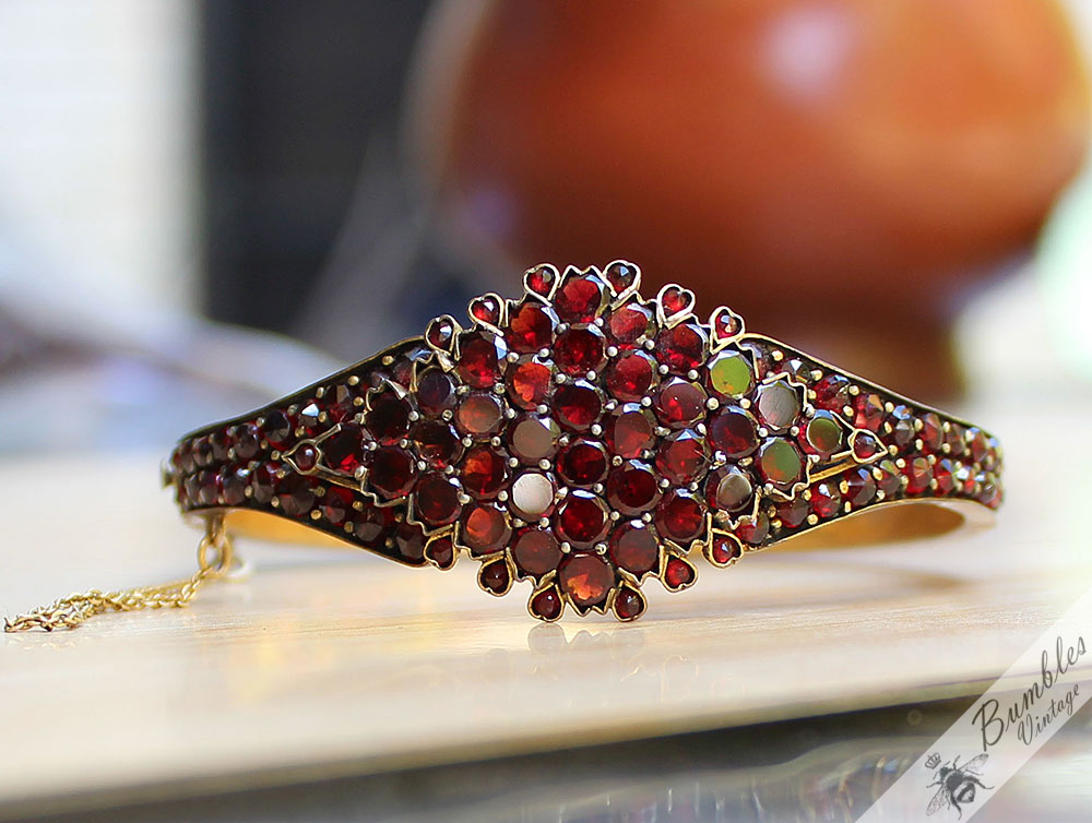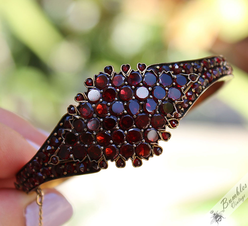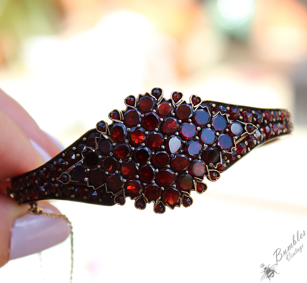 • The cluster is set with table top cut garnets, which makes it highly reflective and blingy.