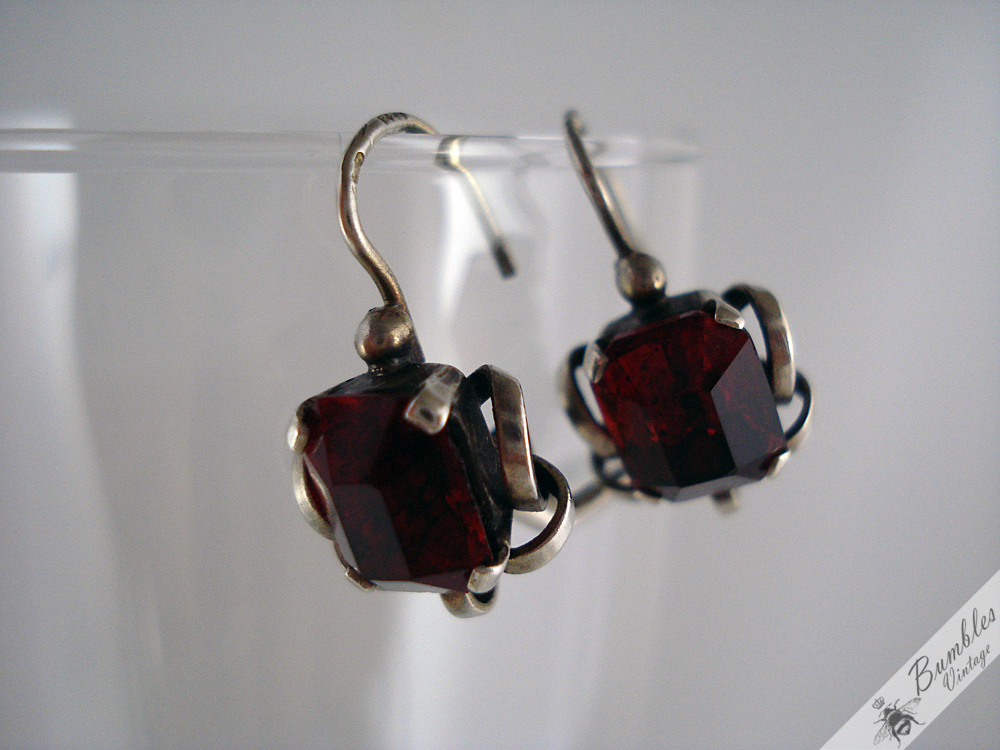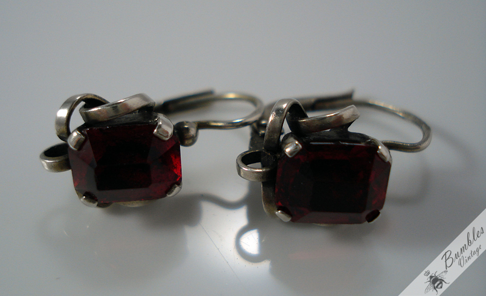 Art Deco Vintage Silver Earrings with Red Faceted Simulated Garnet Stones c1930