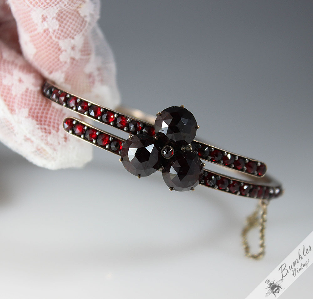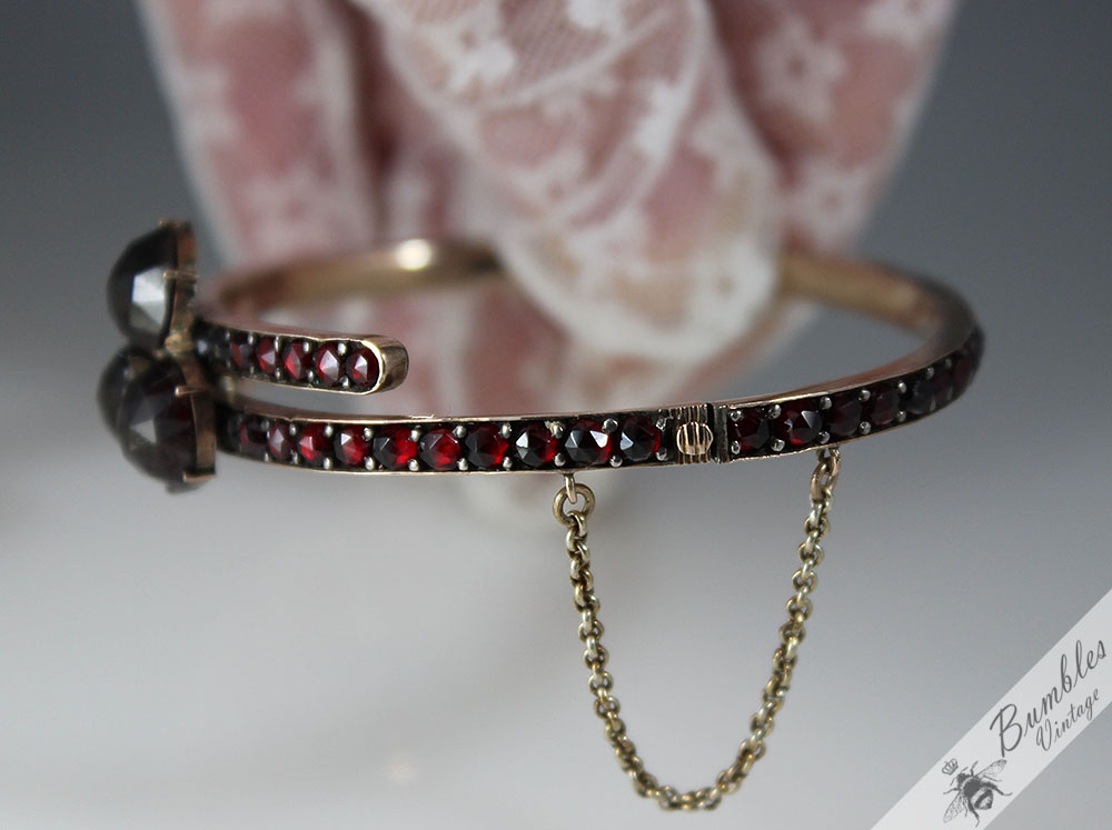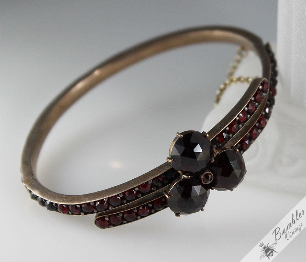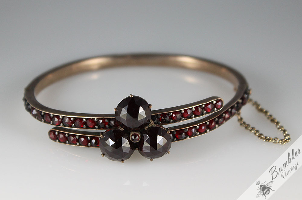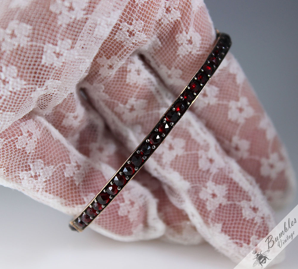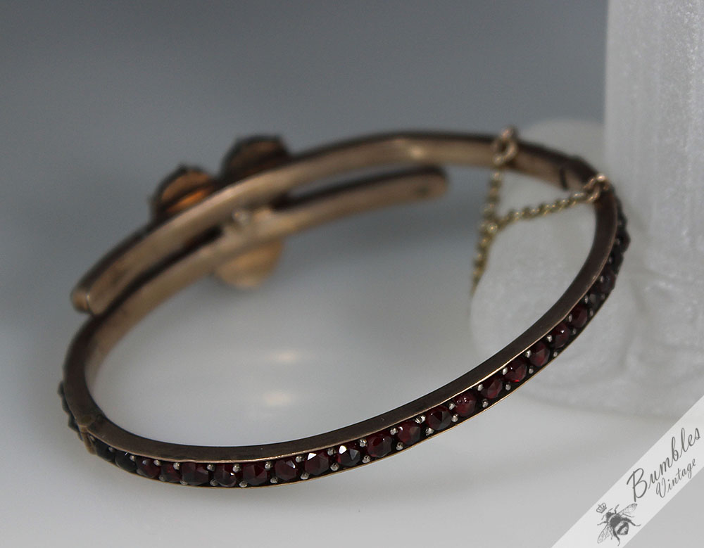 c1900 Antique Rose Cut Bohemian Garnet Hinged Victorian Bangle with 3 Large Garnets