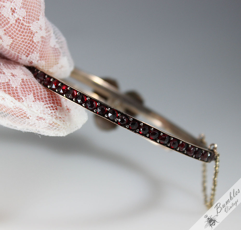 • The metal is made of a base metal (tombak) which was typically used throughout the Victorian period for garnet jewellery.