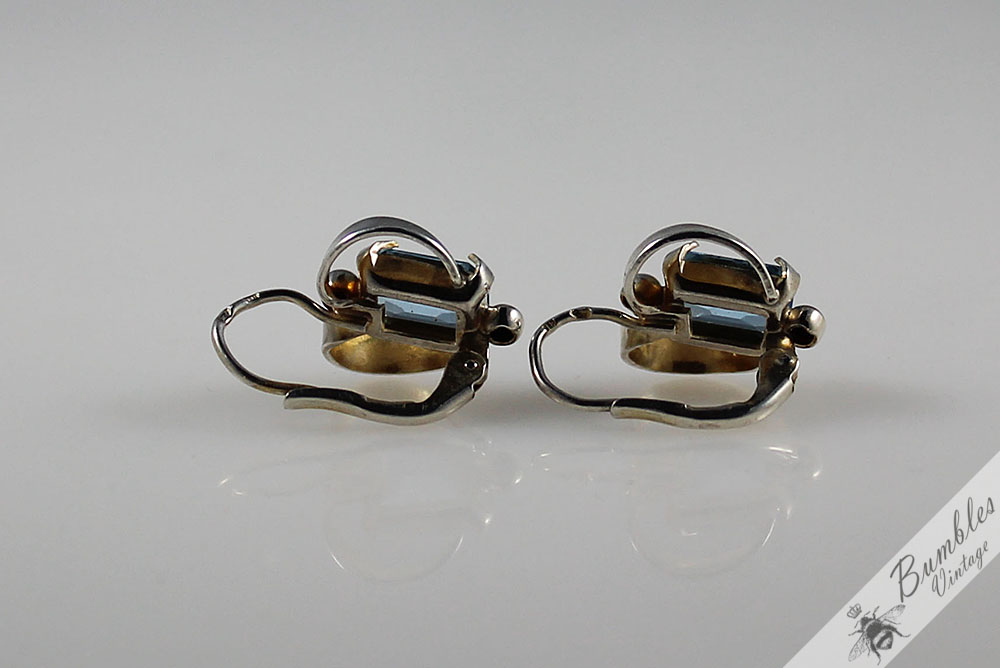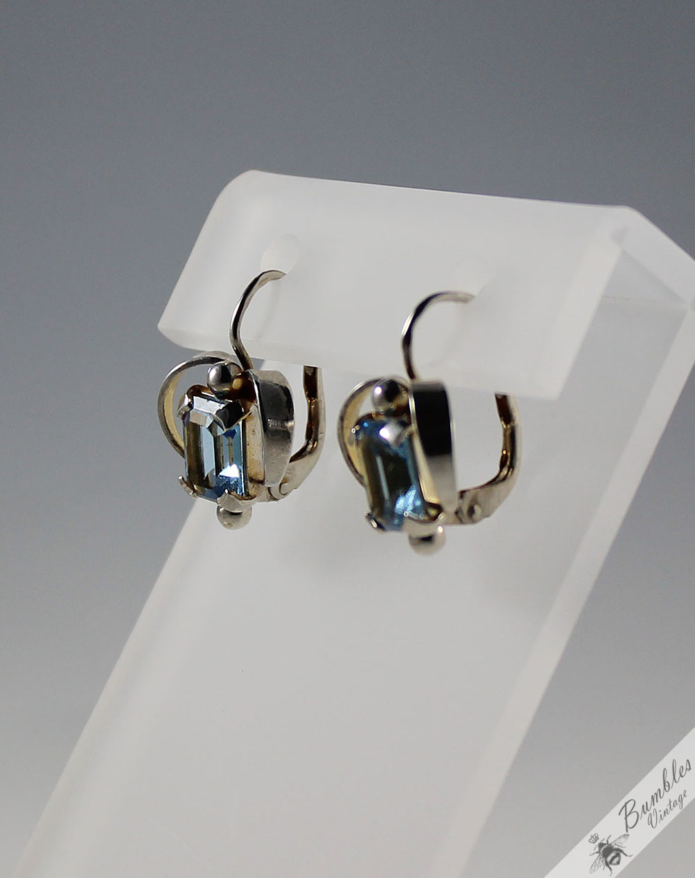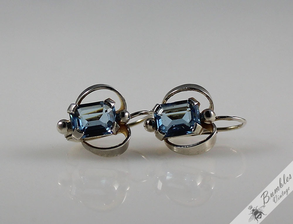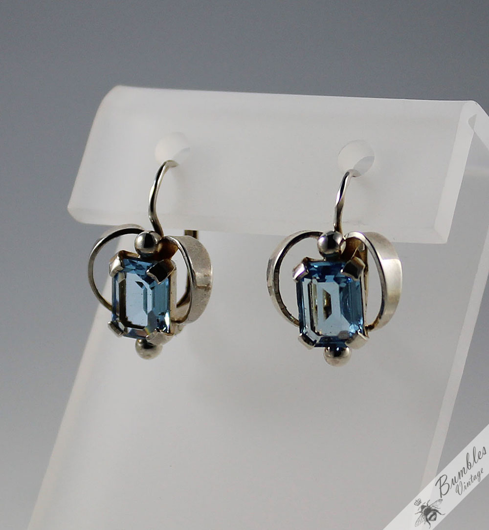 c1960 Vintage Bohemian Art Deco Silver Lever Earrings Czech sim. Aquamarine