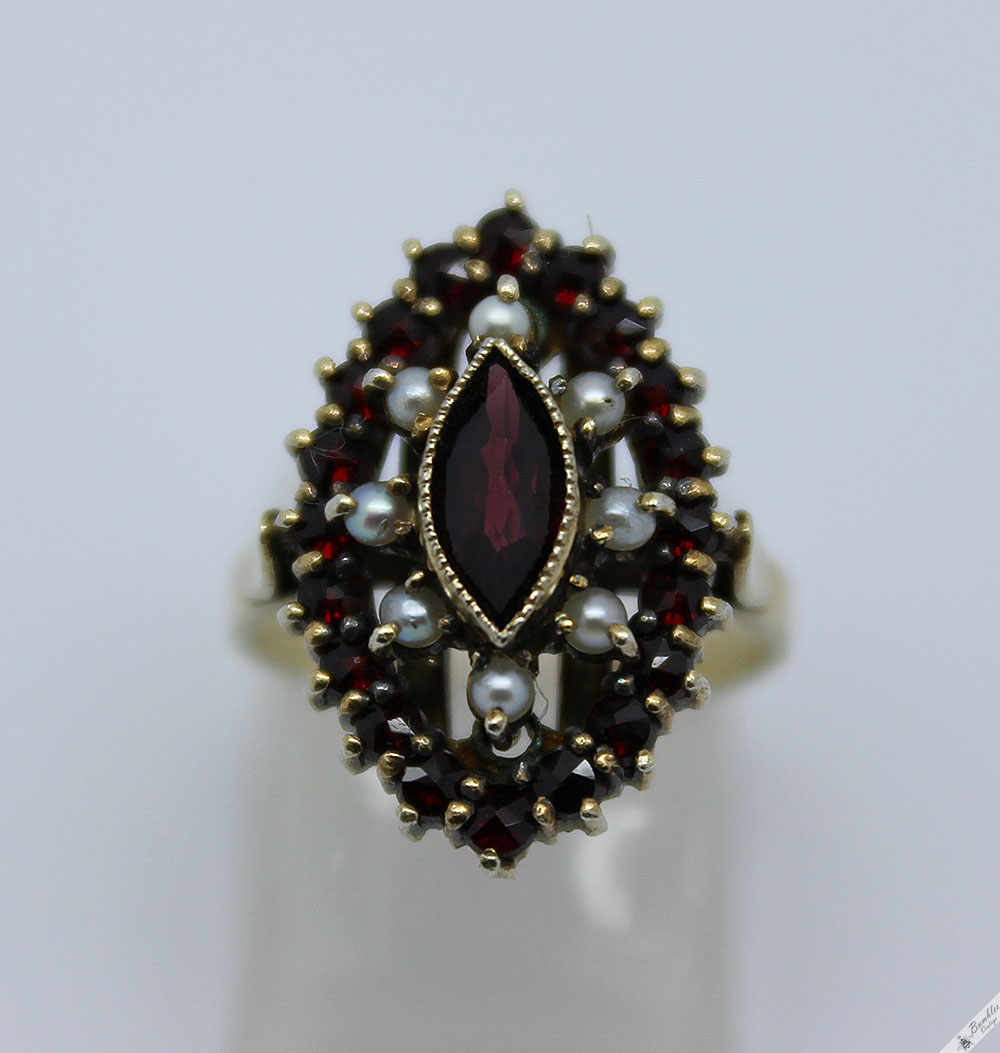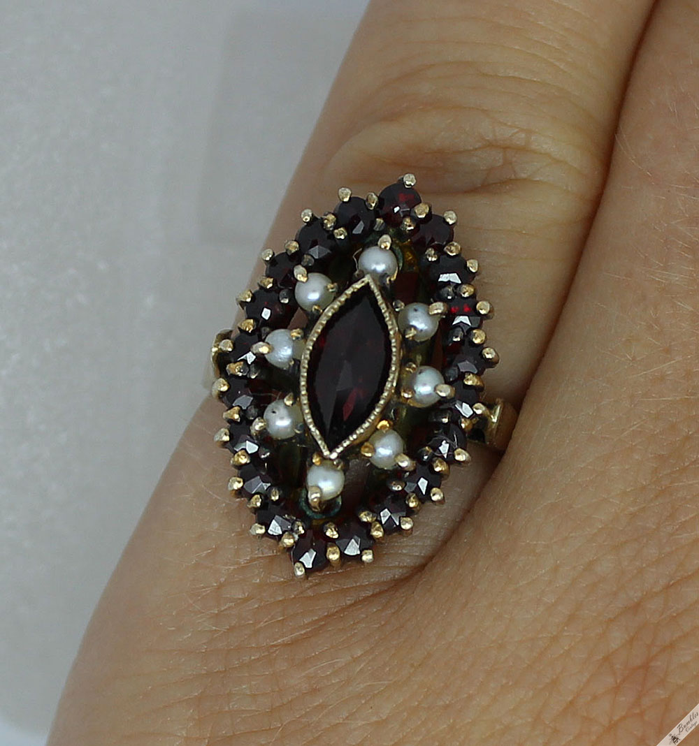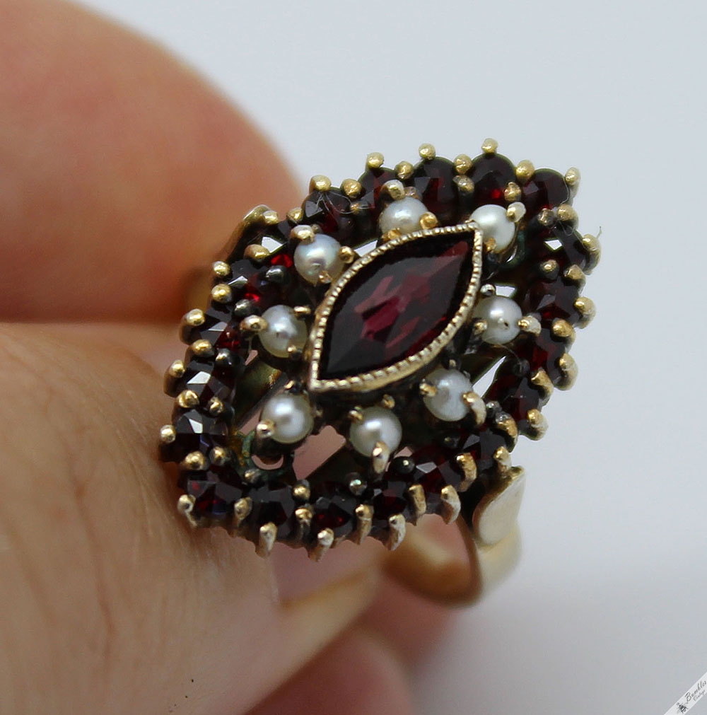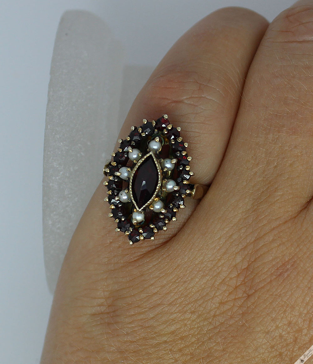 c1960 Vintage Bohemian Garnet Seed Pearl Ring sz K, 5.25
