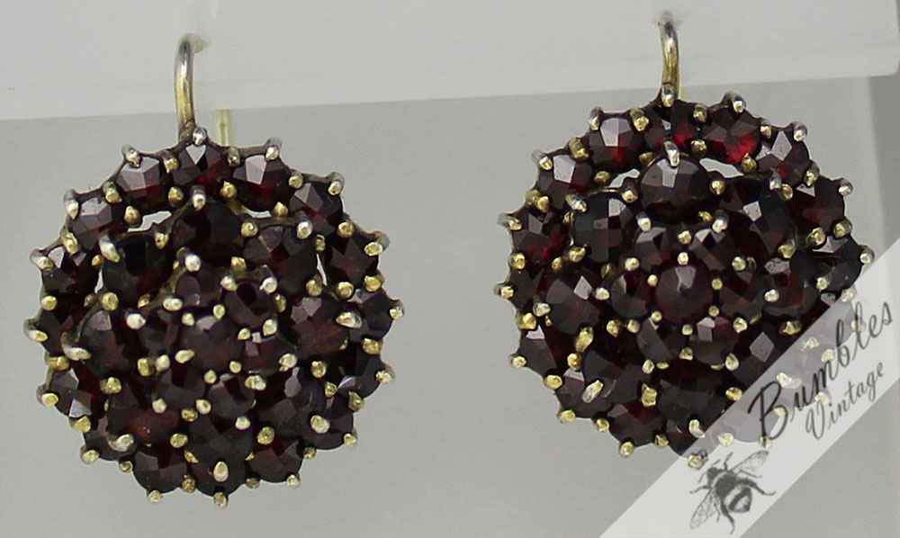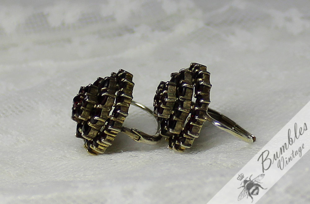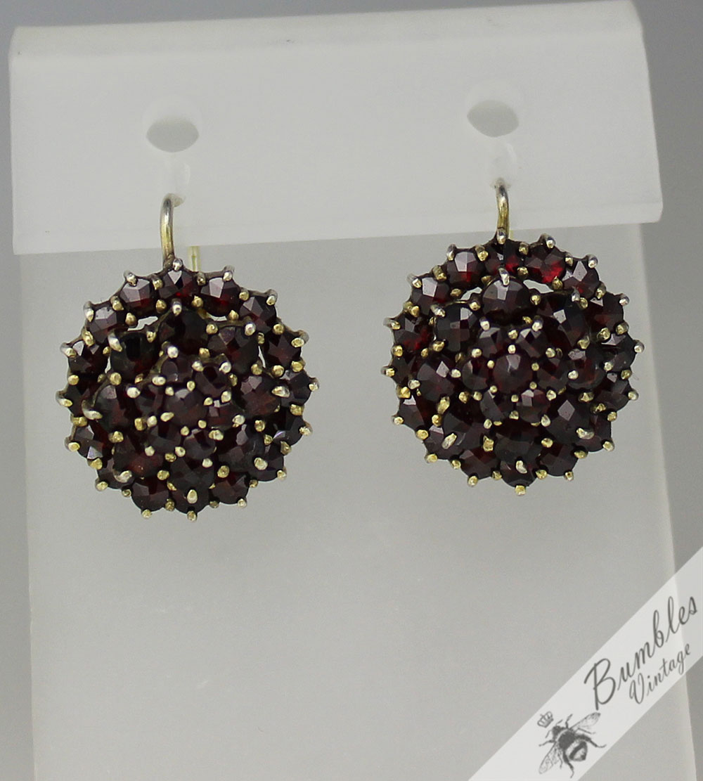 c1960s Vintage Rose Cut Bohemian Garnet 3 Tier Cluster Flower Lever Earrings