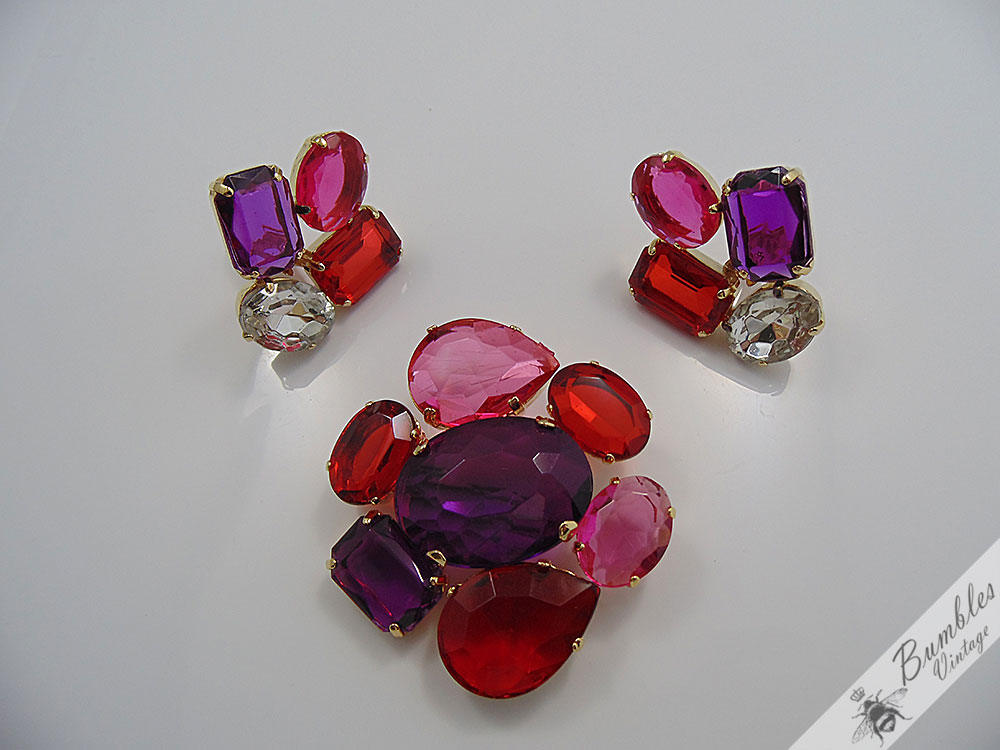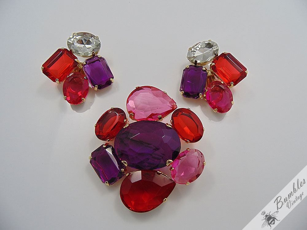 Statement Vintage Translucent Pink Red Purple Plastic Gold Tone Brooch Earring Set