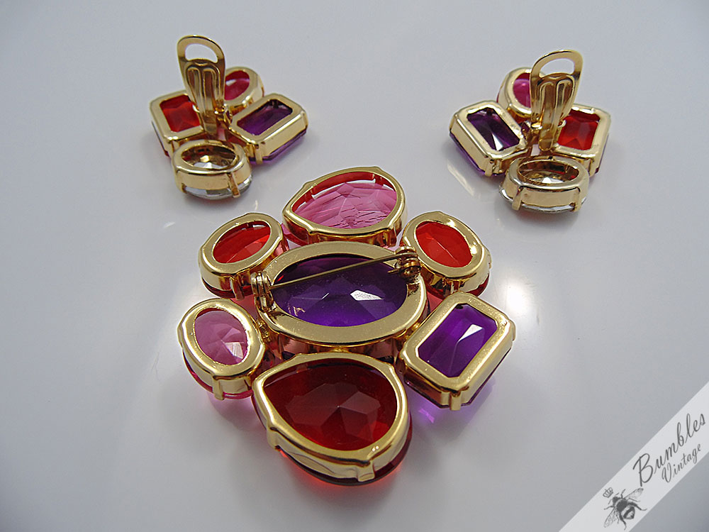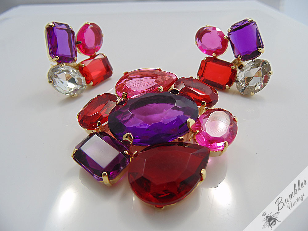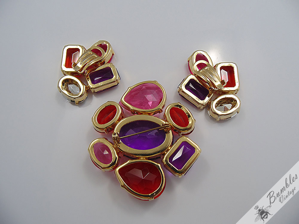 statement-vintage-translucent-pink-red-purple-plastic-gold-tone-brooch-earring-set-s20