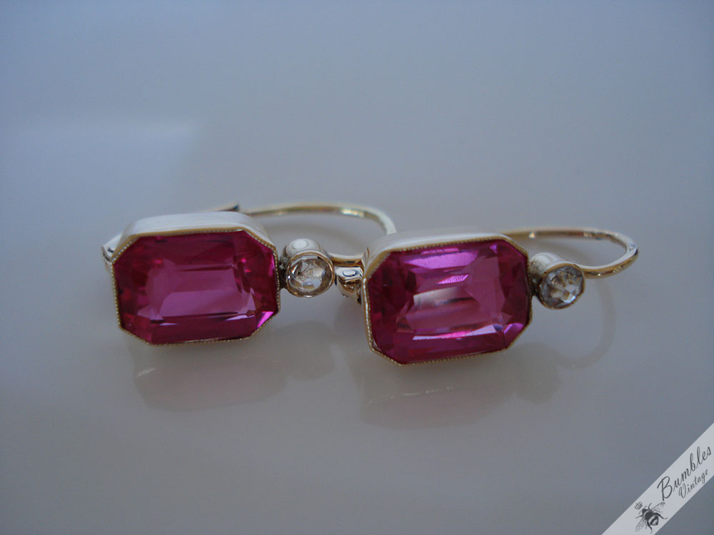 Vintage 14k Gold European Lever Earrings Simulated Ruby