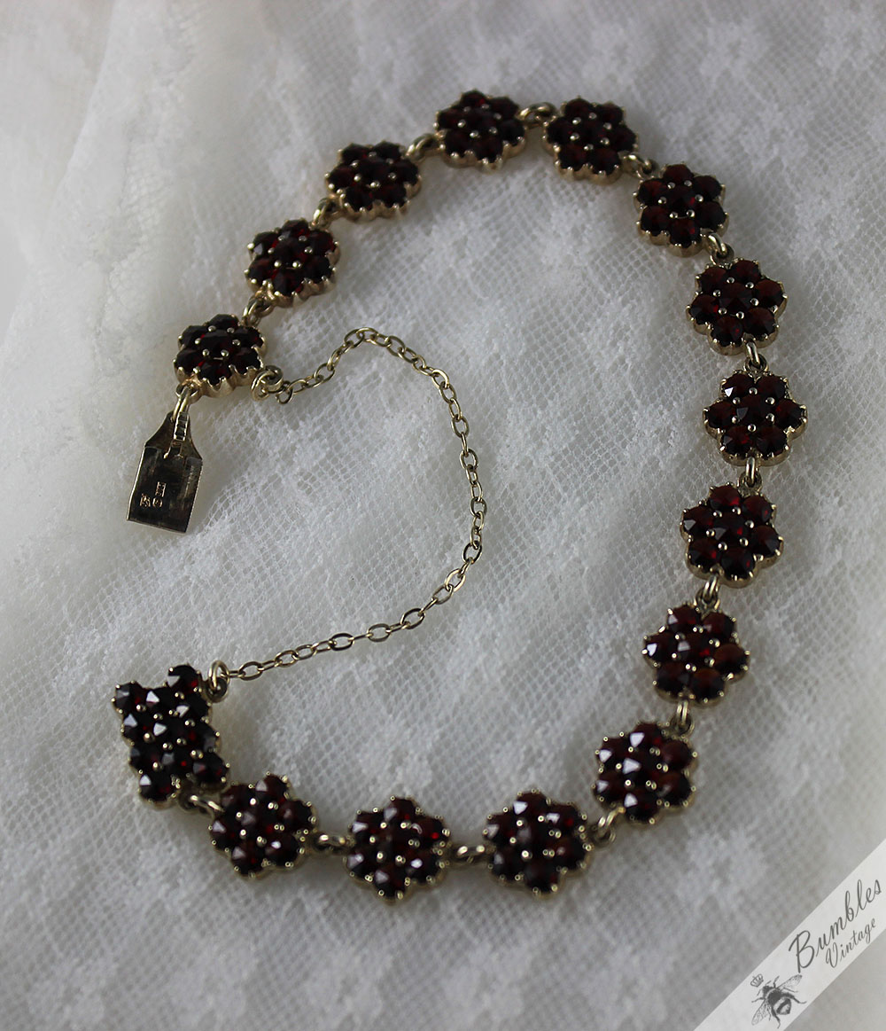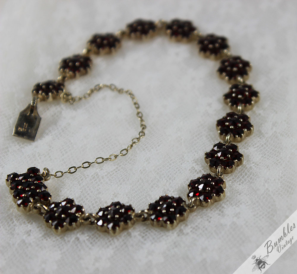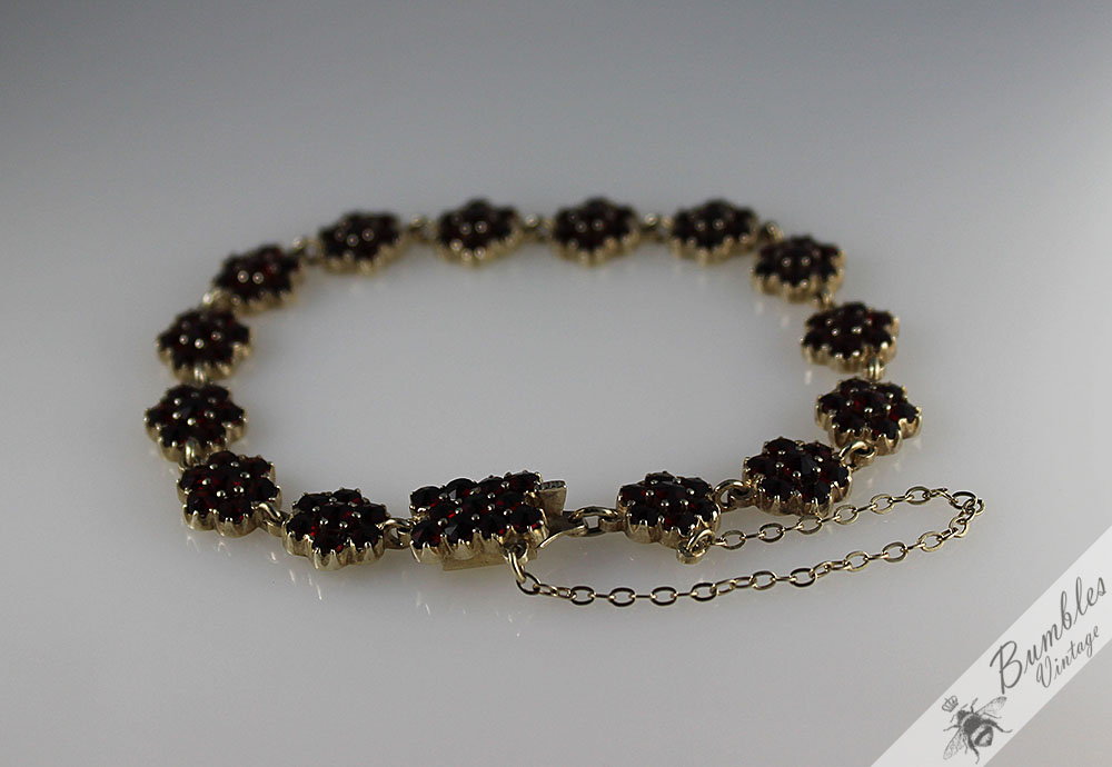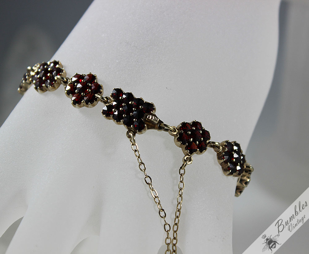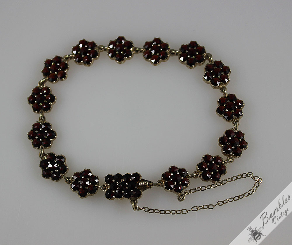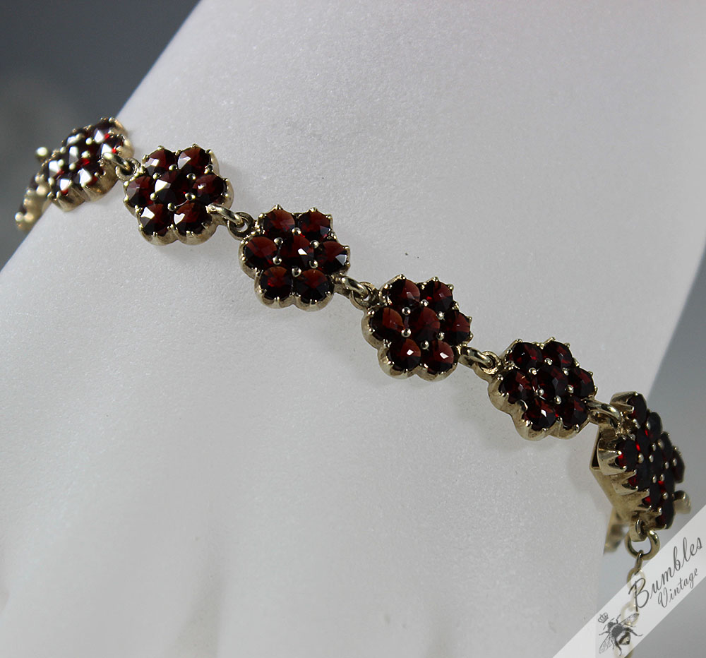 Vintage Rose Cut Bohemian Garnet Link Floral Bracelet Silver Vermeil c1960