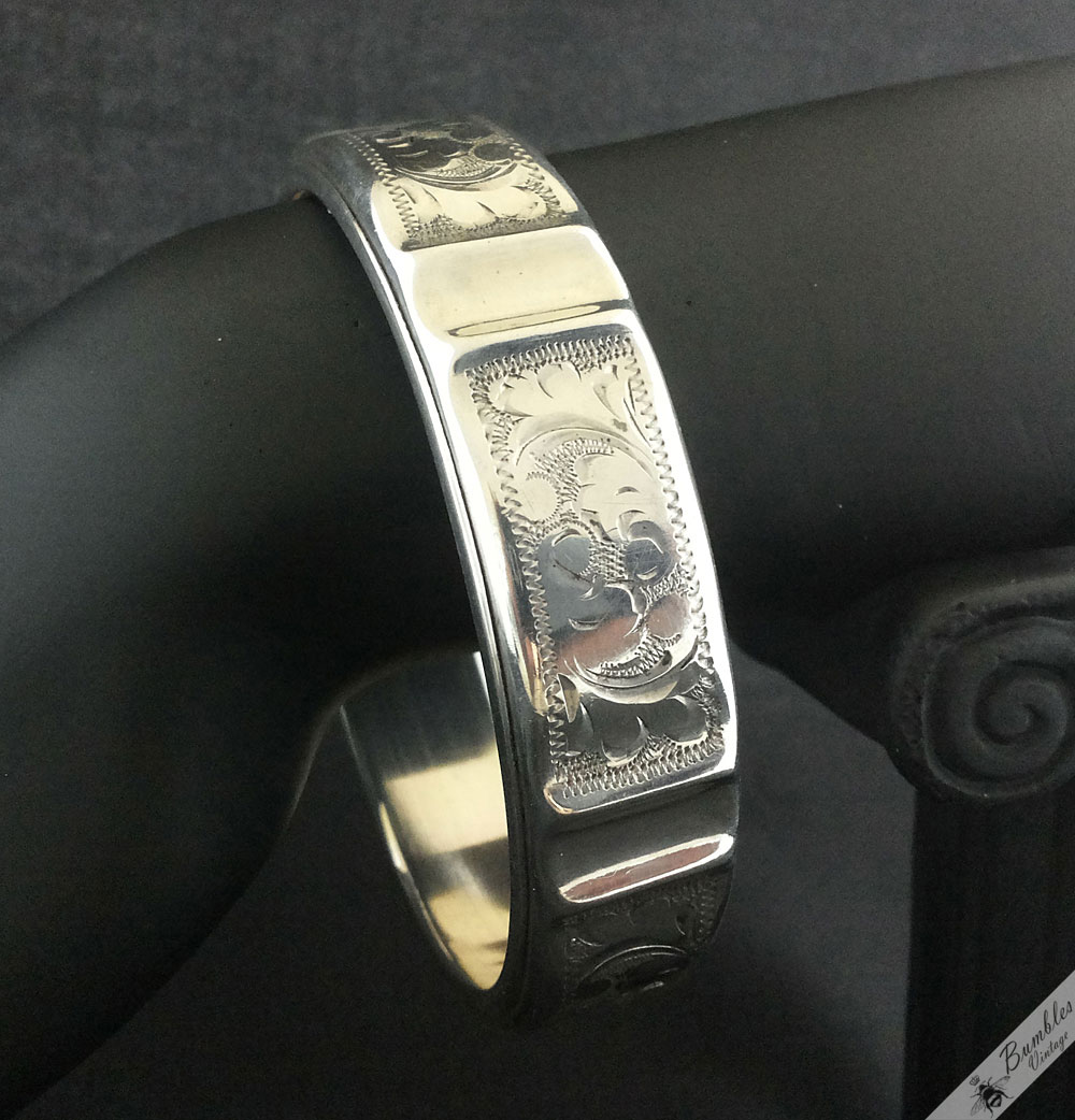 This bangle is richly carved and molded into a beatiful pattern. It is made of 900/1000 silver purity and stamped as such. Polished and ready to wear. The bangle is hallmarked with the triangle mark with the number “3” for 900 silver which was used in Czechoslovakia during the period 1929-1942. It als bears the jeweller’s mark “BT”.